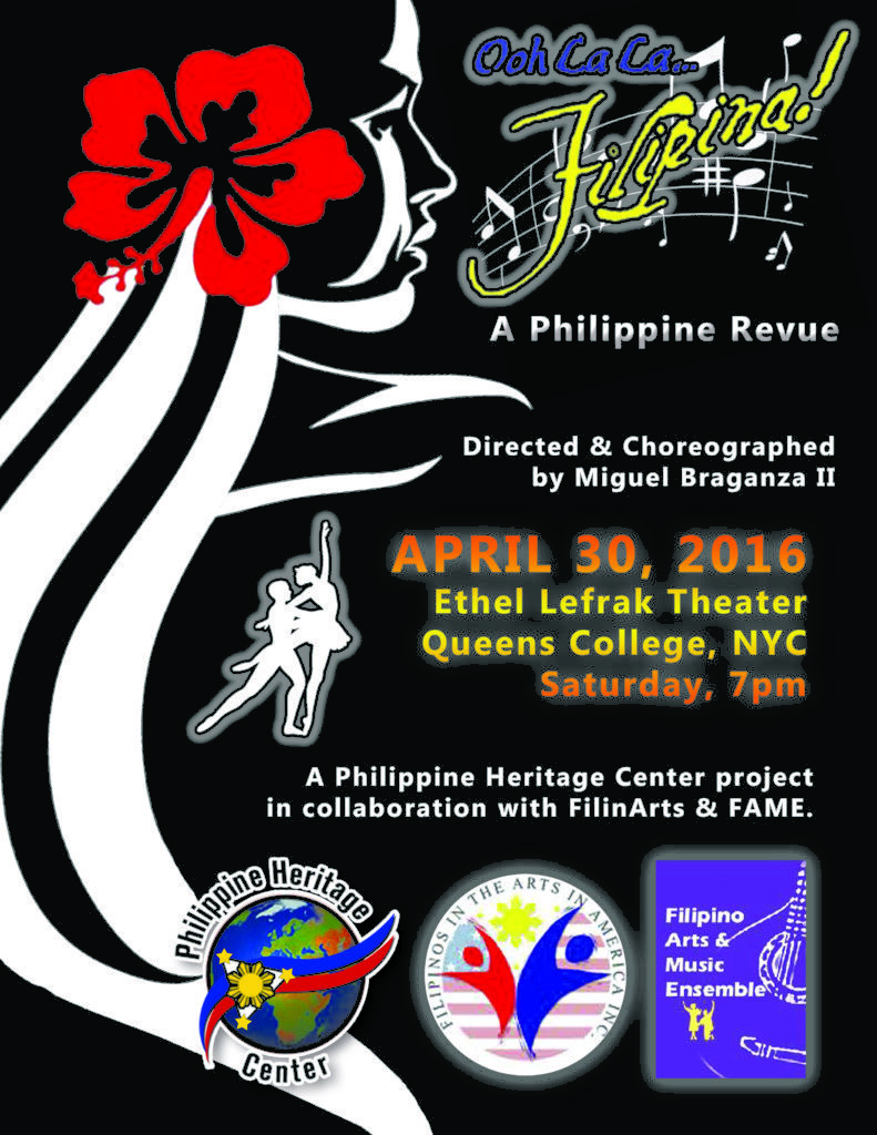 We are holding a special event in collaboration with FILIPINO IN THE ARTS IN AMERICA, INC. (FilinArts) AND THE FILIPINO ARTS & MUSIC ENSEMBLE (FAME): OOH LA LA FILIPINA. Directed and Choreographed by Miguel Braganza II, this special event will take place at Ethel Lefrak Theater in Queens College this coming April 30, 2016.